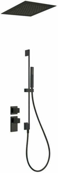Falba építhető kivitel Tartalmazza a termosztátos belső egységet 380 x 380 mm-es rozsdamentes acél mennyezeti fejzuhannyal 760 mm-es zuhanyrúd vízbemenettel Vízkőmentesíte tt kézi zuhannyal Szatén zuhanytömlővel Matt fekete színben