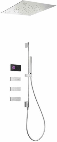 Fekete elektronikus vezérlő Falba építhető elektronikus 3 utas belső egység 500 x 500 mm-es rozsdamentes acél mennyezeti fejzuhannyal 3 vízkőmentesített fúvókával 760 mm-es zuhanyrúd vízbemenettel Vízkőmentesíte tt kézi zuhannyal Szatén zuhanytömlővel Króm kivitel