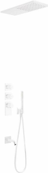Falba építhető kivitel Tartalmazza a termosztátos belső egységet 160 x 550 mm-es rozsdamentes acél fejzuhannyal Kádkifolyóval Vízkőmentesített kézi zuhannyal Szatén zuhanytömlővel Matt fehér színben