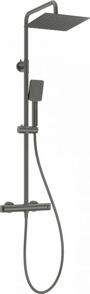 Deante falon kívüli termosztátos zuhanyrendszer, titánium NAC_D4HT Garancia: 5 év Telepítés: falon kívüli szerelés Csaptelep típusa: termosztatikus Zuhanyváltó típusa: mechanikus kerámia Acél rúd Állítható magasság: 850-1225 mm Ultra vékony, szögletes acél zuhanyfej gömbcsuklóval 1 féle vízsugár: eső Zuhanyfej átmérője: 250 mm Zuhanyfej vastagsága: 55 mm Zuhanykar
