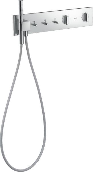 Az alaptest külön rendelendő!!! A következőkből áll: termosztatikus modul, zuhanytartó, kézizuhany, textil zuhanycső 3 funkció Több fogyasztó egyidejű használata Fogantyú csúszó mozgása a víz be- és kikapcsolásához, a hőmérséklet és a vízáramlás szabályozásához Térfogatáramtól és beépítési helyzettől függően kb. 50%-os térfogatáram-csökkentés és inte