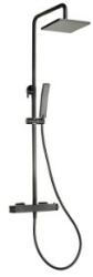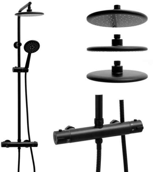 Erga Enza, zuhanygarnitúra termosztatikus csapteleppel és esőfejjel 20cm, fekete matt, ERG-YKA-BP. ENZA20-BLK Műszaki adatok: Gyártó: Erga Anyaga: sárgaréz / porszórt acél / ABS műanyag Szín: fekete matt Fej: kerámia, termosztatikus 35 mm Szett típusa: falra szerelhető, kétlyukú, két fogantyús kapcsolóval, 20 cm átmérőjű esőzuhanyfejjel és kézizuhannyal Csatlakozás: 1/2