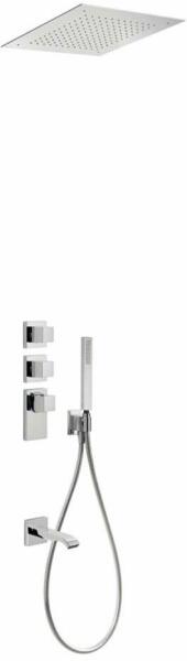 Falba építhető kivitel Tartalmazza a termosztátos belső egységet 380 x 380 mm-es rozsdamentes acél mennyezeti fejzuhannyal Cascade kádkifolyóval Vízkőmentesít ett kézi zuhannyal Szatén zuhanytömlővel Króm kivitel