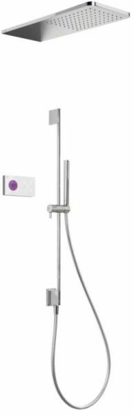 Fehér elektronikus vezérlő Falba építhető elektronikus belső egység 210 x 550 mm-es rozsdamentes acél fejzuhannyal 760 mm-es zuhanyrúd vízbemenettel Vízkőmentesíte tt kézi zuhannyal Szatén zuhanytömlővel Króm kivitel