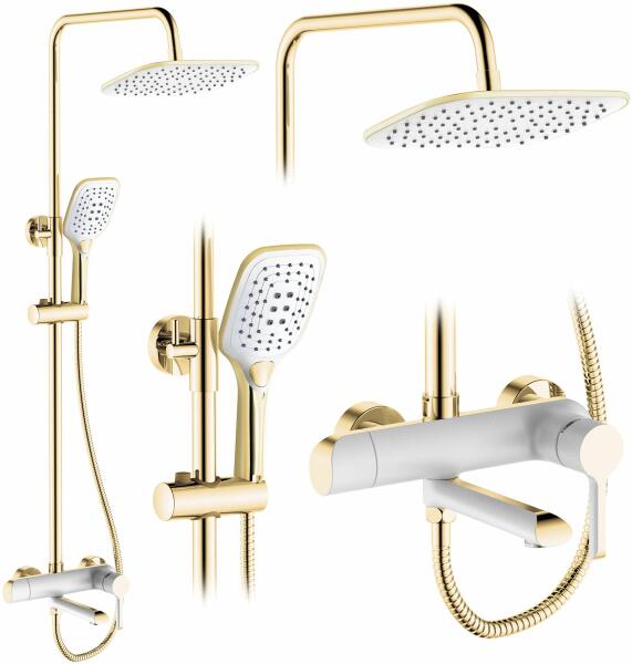 Rea Melia, zuhanygarnitúra kád kifolyóval, fehér-arany, REA-P2406 Gyártó: Rea Sorozat: Melia A készlet tartalma: kád csaptelep, zuhanycső kézi zuhanyfejjel, esőzuhanyfej Akkumulátor test: sárgaréz Vezérlés: kar Szerelés: Falra szerelhető Szerelési távolság: 150 mm Oszlop magasság: 140 cm Szín: fehér/arany fényes Zuhanyfej méretei: 18x28 cm Patak: Eső Vízkőmentesítő r