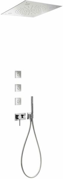 Falba építhető kivitel Tartalmazza a 3 utas belső egységet is 500 x 500 mm-es rozsdamentes acél mennyezeti fejzuhannyal 3 vízkőmentesített fúvókával Vízkőmentesített kézi zuhannyal és fali tartóval Szatén zuhanytömlővel Króm kivitel