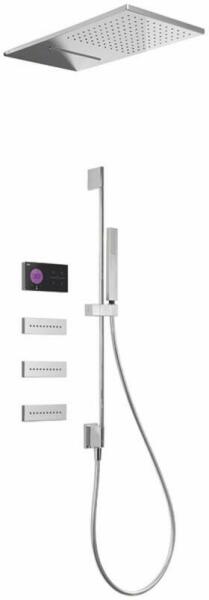 Fekete elektronikus vezérlő Falba építhető elektronikus 4 utas belső egység 280 x 550 mm-es rozsdamentes acél fejzuhany 2 fúvókával 3 vízkőmentesített fúvókával 760 mm-es zuhanyrúd vízbemenettel Vízkőmentesíte tt kézi zuhannyal Szatén zuhanytömlővel Króm kivitel