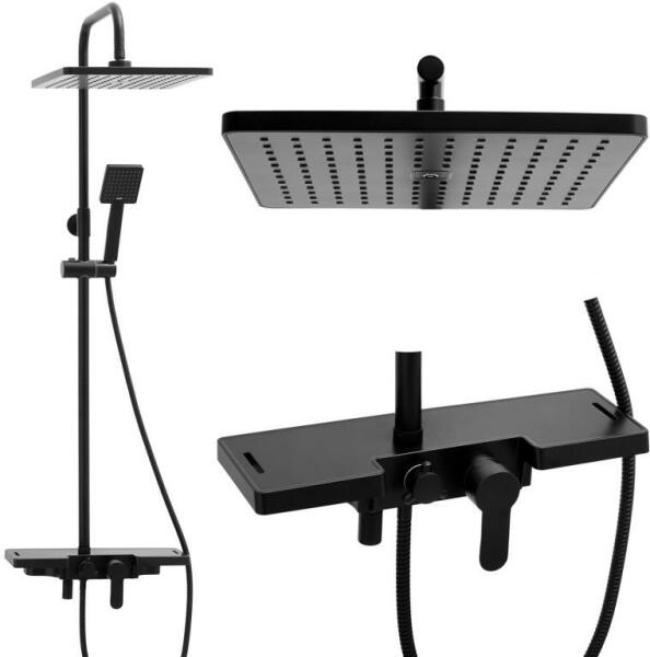 Erga Oslo, zuhanygarnitúra karos csapteleppel, polccal és esőfejjel 30x30 cm, matt fekete, ERG-YKA-BP. OSLO-30-BLK Műszaki adatok Gyártó: Erga Anyaga: sárgaréz / porszórt acél / ABS műanyag Szín: fekete matt Állítható magasságú zuhanyoszlop 85 - 115 cm Fej: Kerámia 35 mm, mechanikus Szett típusa: Falra szerelhető, kétlyukú, egykaros, kapcsolóval, esőzuhanyfejjel 30 x 30 cm