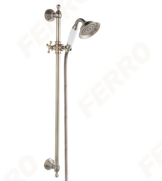 78 cm-es fém zuhanyrúd állítható zuhanytartóval 1 funkciós kézizuhany (eső) kézizuhany átmérője: 9 cm Ferro Easy Clean a vízkőlerakódás könnyű eltávolításához sárgaréz bevonatos 150 cm-es zuhanycső kónuszos vég kivitel: antik bronz