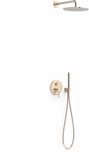 Falba építhető kivitel Tartalmazza a belső egységet Egykaros zuhanycsaptelep 300 mm-es gömbcsuklós oldalfali fejzuhannyal Vízkőmentesített kézi zuhannyal és fali tartóval Szatén zuhanytömlővel Rózsa arany színben