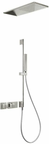 Beépíthető részt tartalmazza 2 utas váltószelep átfolyáskorlátozóval 210 x 550 mm-es fali fejzuhannyal 760 mm-es zuhanyrúd vízbemenettel Vízkőmentesíte tt kézi zuhannyal Szatén zuhanytömlővel Acél színben