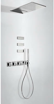 Fehér elektronikus vezérlő Falba építhető elektronikus 3 utas belső egység 500 x 500 mm-es rozsdamentes acél mennyezeti fejzuhany 2 fúvókával Vízkőmentesített kézi zuhannyal és fali tartóval Szatén zuhanytömlővel Króm kivitel