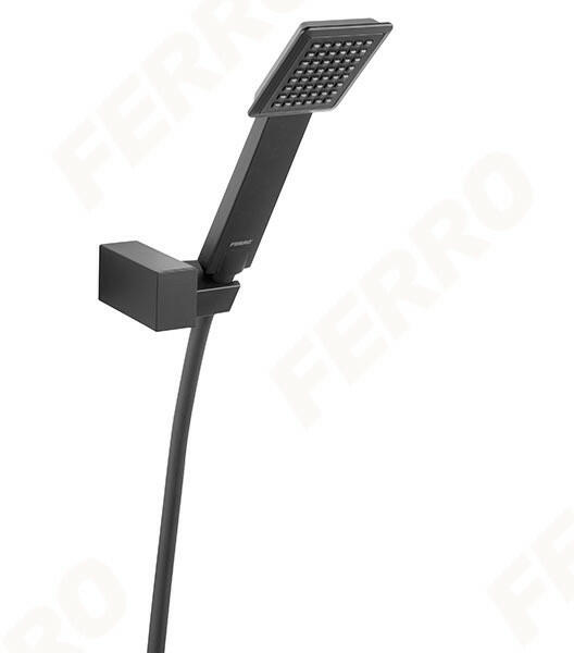 1 funkciós kézizuhany funció: eső Ferro Easy Clean System - a vízkőlerakódás könnyű eltávolításához PVC zuhanycső hossza: 150 cm kúpos tömlővég egypontos fali rögzítés állítható dőlésszöggel matt fekete felület
