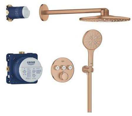 az alábbiakból áll:falsík mögötti termosztát, 3 fogyasztóra (29 121)GROHE Rapido SmartBox univerzális beépítő doboz, 1/2" (35 604)Rainshower SmartActive 310 2 funkciós fejzuhany készlet (26 475), tartalmazza a 430 mm-es vízszintes zuhanykart és a fejzuhany bépítő készletet (26 483)Rainshower SmartActive 130 3 funkciós kézizuhanyzuhany kivezető könyök 1/2" tartóval (26 658