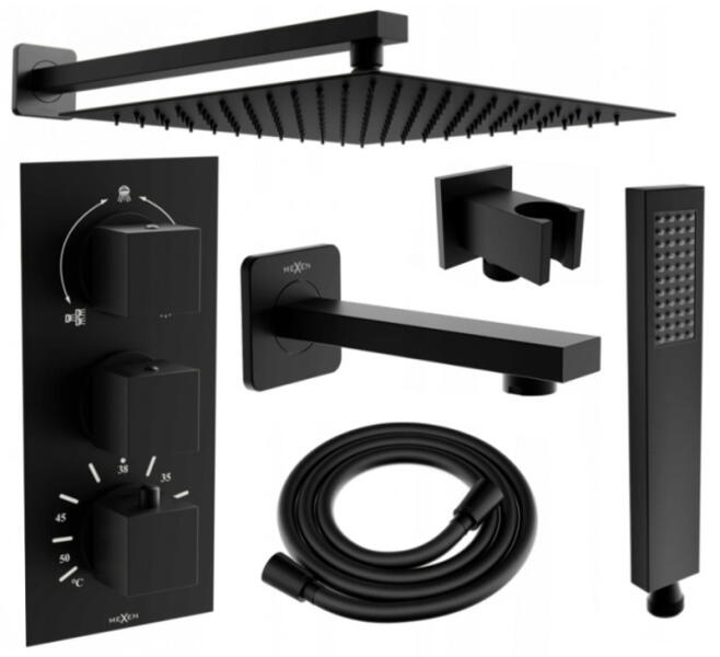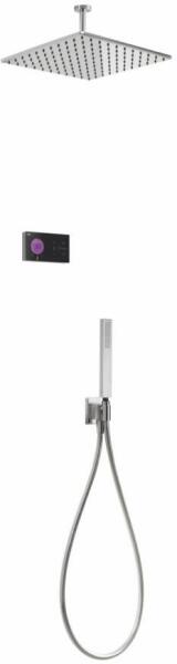 Fekete elektronikus vezérlőpanel Falba építhető elektronikus belső egységet tartalmazza 300 x 300 mm-es gömbcsuklós mennyezeti fejzuhannyal Vízkőmentesített kézi zuhannyal és fali tartóval Szatén zuhanytömlővel Króm kivitel