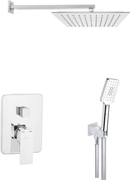Invena Nyks, rejtett zuhanygarnitúra 2 kivezetéses testtel, fényes króm, INV-BS-28-0K2-A Gyártó: INVENA Sorozat: NYKS Katalógusszám: BS-28-0K2 Termékleírás: Felső esőzuhany: négyzet alakú 25 x 25 cm, vékony, ABS, Calc Rejtett zuhanykar: hossza 40 cm Zuhany csaptelep, rejtett, 2-funkciós Kézizuhanyfej 3 x 23 cm, 3 funkciós (normál folyású, vegyes, masszázs) Anti-Calc rendszer