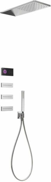Fekete elektronikus vezérlő Falba építhető elektronikus 3 utas belső egység 210 x 550 mm-es rozsdamentes acél fejzuhannyal 3 vízkőmentesített fúvókával Vízkőmentesített kézi zuhannyal és fali tartóval Szatén zuhanytömlővel Króm kivitel