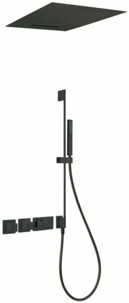 Falba építhető kivitel Tartalmazza a belső termosztátos egységet Átfolyáskorlátozóv al 500 x 500 mm-es rozsdamentes acél fejzuhany 2 fúvókával 760 mm-es zuhanyrúd vízbemenettel Vízkőmentesíte tt kézi zuhannyal Szatén zuhanytömlővel Matt fekete színben