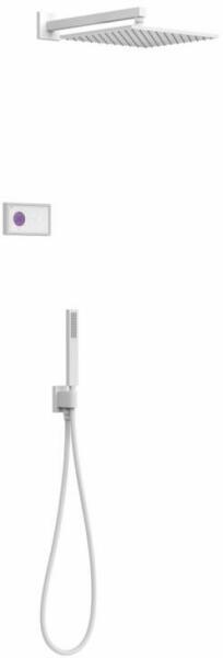 Fehér elektronikus vezérlőpanel Falba építhető elektronikus belső egységet tartalmazza 300 x 300 mm-es gömbcsuklós fejzuhannyal Vízkőmentesített kézi zuhannyal és fali tartóval Szatén zuhanytömlővel Matt fehér színben