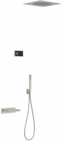 Fekete elektronikus vezérlőpanel Falba építhető elektronikus 3 utas belső egységet tartalmazza 380 x 380 mm-es rozsdamentes acél mennyezeti fejzuhannyal Acél cascade kádkifolyóval Vízkőmentesít ett kézi zuhannyal és fali tartóval Szatén zuhanytömlővel Acél színben