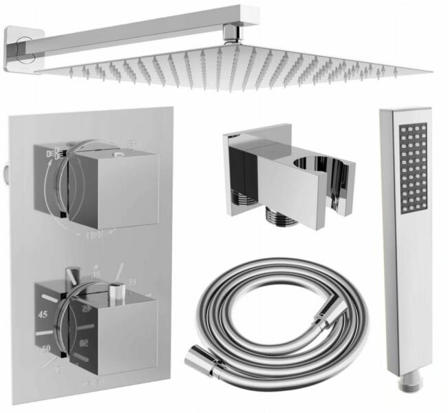 Mexen CUBE - 2 utas, rejtett zuhanygarnitúra 6 az 1-ben, króm, 5907709105775 A készlet tartalma: 1. Termosztatikus keverő króm, rejtett keverő kapcsolóval (2 kimenetes ház) - 77502-00 Anyaga: sárgaréz Fej: termosztatikus 1/2"-os csatlakozás Forró víz blokkolása 38 ° C-on Szín: króm csaptelep rejtett testtel és burkolattal 2. Sarokcsatlakozás 1/2 "- 79300- 00 Sárgarézből kés