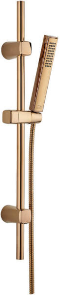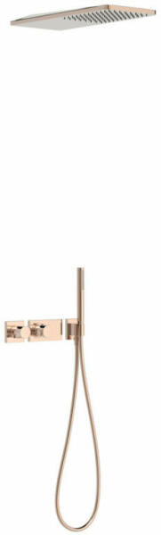 Termosztátos falba építhető zuhanyrendszer Tartalmazza a belső termosztátos egységet 210 x 550 mm-es rozsdamentes acél fali fejzuhannyal Vízkőmentesített kézi zuhannyal Szatén zuhanytömlővel Rózsa arany színben