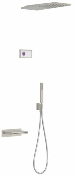 Fehér elektronikus vezérlőpanel Falba építhető elektronikus 3 utas belső egységet tartalmazza 210 x 550 mm-es rozsdamentes acél fejzuhannyal Acél cascade kádkifolyóval Vízkőmentesít ett kézi zuhannyal és fali tartóval Szatén zuhanytömlővel Acél színben
