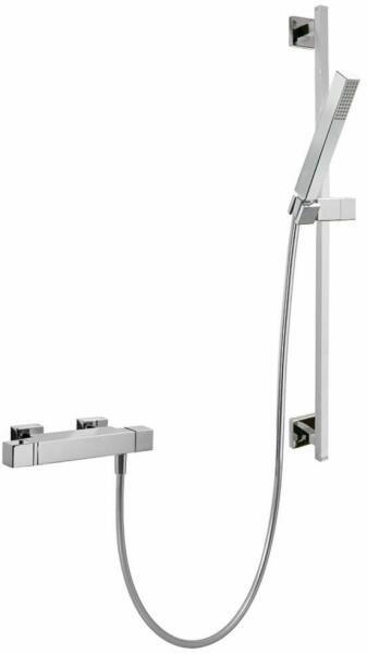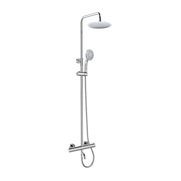 Falon kívüli kivitel Termosztátos zuhanycsaptelep 842 mm-es zuhanyrúddal Vízkőmentesítet t kézi zuhannyal Szatén zuhanytömlővel Króm kivitel