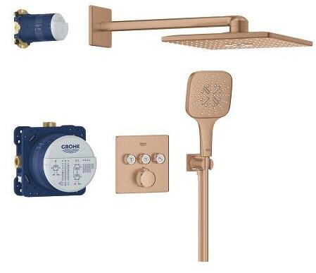 az alábbiakból áll:falsík mögötti termosztát, 3 fogyasztóra (29 126)GROHE Rapido SmartBox univerzális beépítő doboz, 1/2" (35 604)Rainshower SmartActive 310 Cube 2 funkciós fejzuhany szettel (26 479), tartalmazza a 430 mm-es vízszintes zuhanykart és a fejzuhany bépítő szettjét (26 483)Rainshower SmartActive 130 Cube 3 funkciós kézizuhanyzuhany kivezető könyök 1/2" tartóval