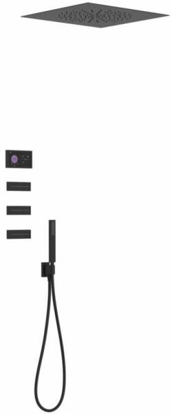 Fekete elektronikus vezérlő Falba építhető elektronikus 3 utas belső egység 500 x 500 mm-es rozsdamentes acél mennyezeti fejzuhannyal 3 vízkőmentesített fúvókával Vízkőmentesített kézi zuhannyal és fali tartóval Szatén zuhanytömlővel Matt fekete színben