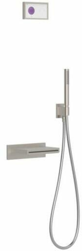 Fehér elektronikus vezérlőpanel Falba építhető elektronikus 2 utas belső egységet tartalmazza Acél cascade kádbeömlő Vízkőmentesített kézi zuhannyal és fali tartóval Szatén zuhanytömlővel Acél színben