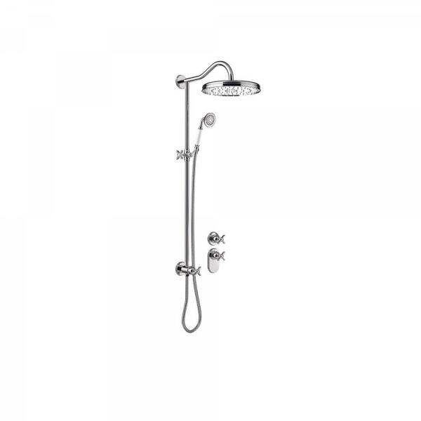 Falon kívüli kivitel Tartalmazza a termosztátos belső egységet 310 mm-es gömbcsuklós fejzuhannyal 78 mm-es vízkőmentesített kézi zuhannyal Duplán reteszelt zuhanytömlővel Króm kivitel