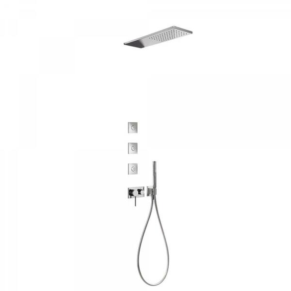 Falba építhető kivitel Tartalmazza a 3 utas belső egységet is 160 x 550 rozsdamentes acél fejzuhannyal 3 vízkőmentesített fúvókával Vízkőmentesített kézi zuhannyal és fali tartóval Szatén zuhanytömlővel Króm kivitel