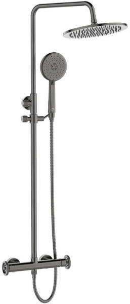 Laveo Muro, zuhanygarnitúra esőfejjel és kézizuhanyfejjel, grafit, LAV-PLU_10OB A MURO sorozat loft stílusú belső terekhez készült. A csaptelepeket stilizált gombok jellemzik, utalva a Łódź gyári múltjára, ahonnan a LAVEO márka ered. A sorozat ipari jellegét a kifolyók bordázott végei adják, stílusosan illeszkedve a csapokhoz. A MURO szerelvényei 8 fürdőszobai modellből