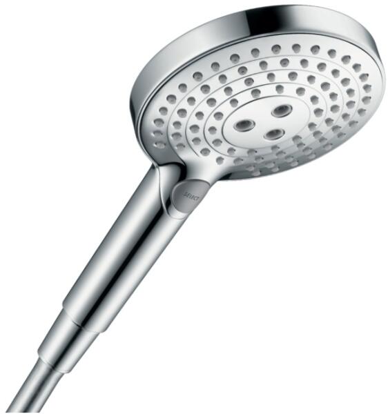 Hansgrohe Raindance Select E króm-fehér kézi zuhanyfej 120 3jet 26520400 zuhanyfej mérete: 120 mm kényelmes vízsugár választás a Select gombbal vízsugár fajta: RainAir, Rain, Whirl maximális átfolyási mennyiség 3 bar mellett: 15 l/perc belső vízvezetéssel kiöblíthető beépített szűrővel csatlakozómenet G ½ átfolyós vízmelegítőkhöz alkalmas Kérdés esetén munkatár