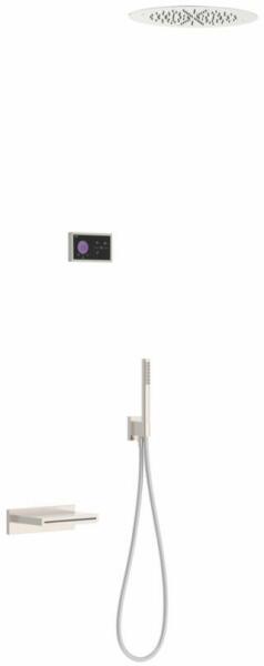 Fekete elektronikus vezérlőpanel Falba építhető elektronikus 3 utas belső egységet tartalmazza 380 mm átmérőjű rozsdamentes acél mennyezeti fejzuhannyal Acél cascade kádkifolyóval Vízkőmentesít ett kézi zuhannyal és fali tartóval Szatén zuhanytömlővel Acél színben