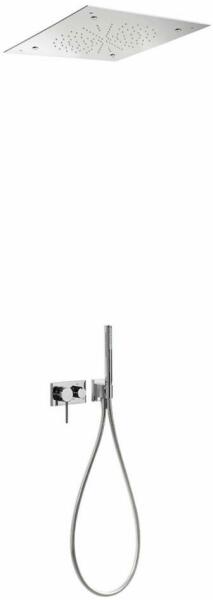 Falba építhető kivitel Tartalmazza a 3 utas belső egységet is 500 x 500 mm-es rozsdamentes acél mennyezeti fejzuhannyal Vízkőmentesített kézi zuhannyal és fali tartóval Szatén zuhanytömlővel Króm kivitel