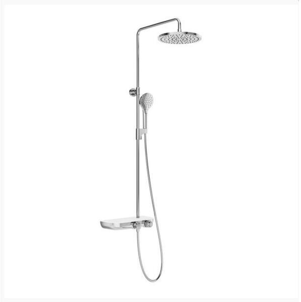 Termo zuhanyoszlop Stop funkcióval és polccal króm/fehér az oszlop magassága: változtatható - 91-122,5 cm közötti tartományban állítható csaptelepbetét: termosztátos, amely alkalmas a víz hőmérsékletének szabályozására termo funkciós forgatógomb a szükséges vízhőmérséklet beállításához kapcsoló a fejzuhany és a kézi zuhanyfej közötti átkapcsoláshoz stop fu