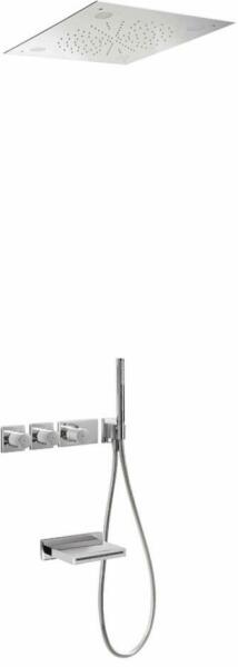 Falba építhető kivitel Tartalmazza a belső termosztátos egységet Átfolyáskorlátozóv al 500 x 500 mm-es rozsdamentes acél mennyezeti fejzuhannyal Acél cacsacde kádkifolyóval Vízkőmentesít ett kézi zuhannyal Szatén zuhanytömlővel Króm kivitel
