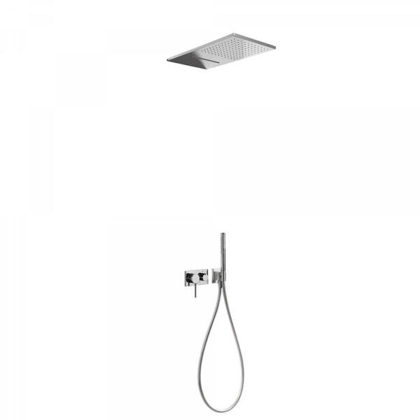 Falba építhető kivitel Tartalmazza a 3 utas belső egységet is 280 x 550 mm-es rozsdamentes acél mennyezeti fejzuhannyal Vízkőmentesített kézi zuhannyal és fali tartóval Szatén zuhanytömlővel Króm kivitel