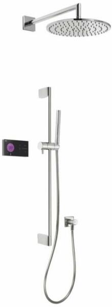 Fekete elektronikus vezérlő Falba építhető elektronikus belső egység 300 mm-es gömbcsuklós fejzuhannyal 760 mm-es zuhanyrúddal Vízkőmentesítet t kézi zuhannyal és fali tartóval Szatén zuhanytömlővel Króm kivitel