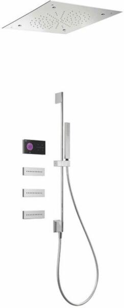 Fekete elektronikus vezérlő Falba építhető elektronikus 4 utas belső egység 500 x 500 mm-es rozsdamentes acél mennyezeti fejzuhany 2 fúvókával 3 vízkőmentesített fúvókával 760 mm-es zuhanyrúd vízbemenettel Vízkőmentesíte tt kézi zuhannyal Szatén zuhanytömlővel Króm kivitel