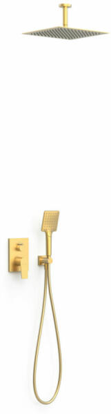 Tres Project falsík alatti zuhanyrendszer Rapid-Box belső egységgel, matt arany 21128030OM Falba süllyesztett szerelés, beépített RAPID-BOX Elzárás és áramlásszabályozás Rapid-bo x és rejtett test, gyorsan és egyszerűen telepíthető Rozsdamentes acélból készült fix zuhanyfej 300x300 mm Zuhanyfej rögzítése: mennyezet Zuhanytartó Vízkő elleni kézi zuhany 96x110mm (3 funk