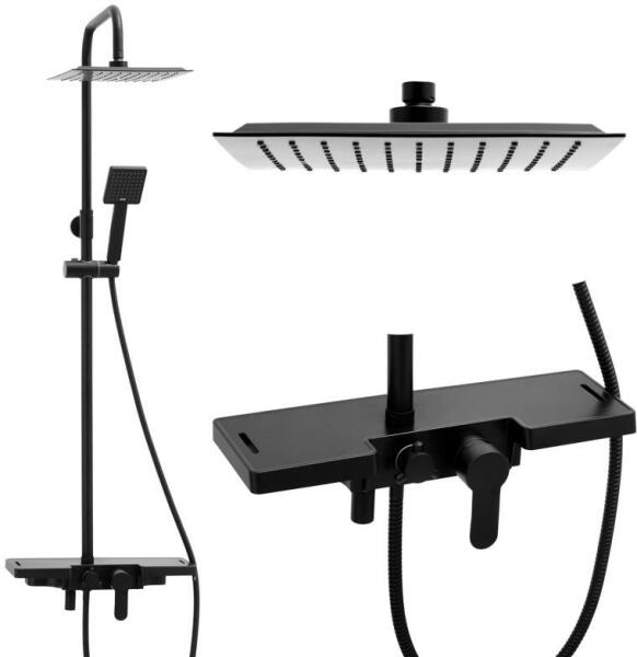 Erga Oslo, zuhanygarnitúra karos csapteleppel és polccal, fekete matt, ERG-YKA-BP. OSLO-25-BLK Műszaki adatok Gyártó: Erga Anyaga: sárgaréz / porszórt acél / ABS műanyag Szín: fekete matt Állítható magasságú zuhanyoszlop 85 - 115 cm Fej: Kerámia 35 mm, mechanikus Szett típusa: Falra szerelhető, kétlyukú, egykaros, kapcsolóval, esőzuhanyfejjel 25 x 25 cm és kézi zuhannyal C