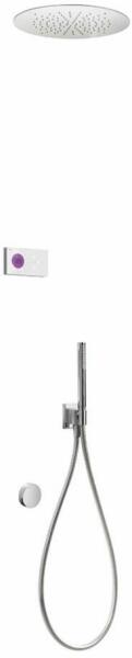 Fehér elektronikus vezérlőpanel Falba építhető elektronikus 3 utas belső egységet tartalmazza 380 mm átmérőjű rozsdamentes acél mennyezeti fejzuhannyal Acél cascade kádbeömlővel Vízkőmentesít ett kézi zuhannyal és fali tartóval Szatén zuhanytömlővel Króm kivitel