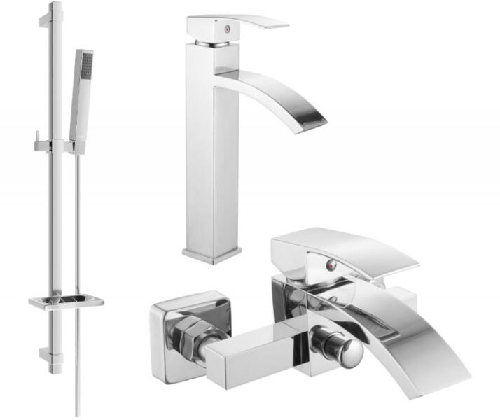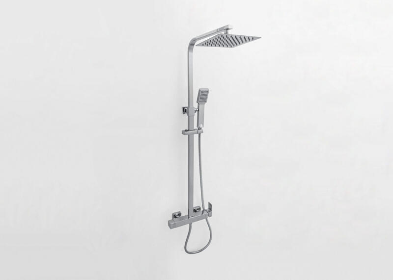 Zuhanyszett|Szín: króm|2 utas, mechanikus csaptelep|Magasság: min. 77 - max. 123 cm|Szélesség: 20 cm|Fejzuhany: 20x20 cm (szögletes)|Szükséges víznyomás: max. 5 bar|Kézizuhany: szögletes