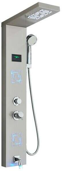 Zuhanypanel, fürdőfunkciós modell, nikkel színben. _x000D_ _x000D_ Külső részén korrózióálló réteg borítja, amely biztosítja a hosszú távú használatot. _x000D_ _x000D_ A panel hőmérséklet-kijelzővel és LED-világítással ellátott képernyővel van felszerelve. _x000D_ _x000D_ Kiváló szűrés a több szűrőnek köszönhetően. _x000D_ A panel a falra van szerelve. _x000