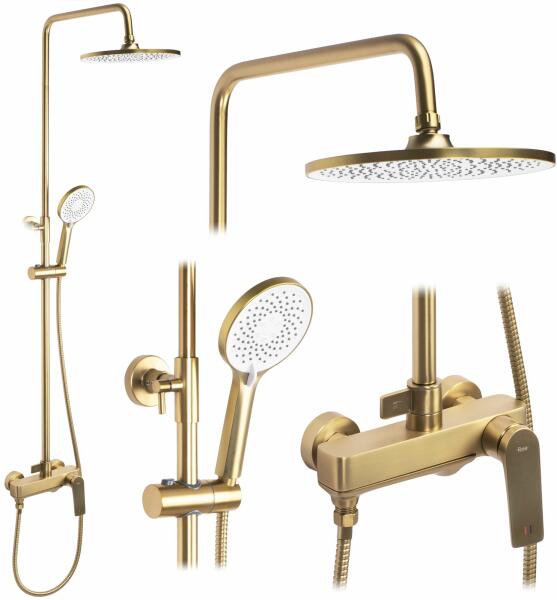 Rea Avalon, zuhanygarnitúra esőfejjel és kézi zuhanyfejjel, arany matt, REA-P2400 Gyártó: Rea Sorozat: Avalon Típus: zuhanygarnitúra karos csapteleppel Beépítési mód: falra szerelhető Szerelési távolság: 150 mm Anyaga: sárgaréz Felület: arany matt Állítható oszlopmagasság: 920 - 1530 mm Fej: kerámia 250 mm átmérőjű esőfej A zuhanycső hossza: 150 cm Mechanikus kád kif