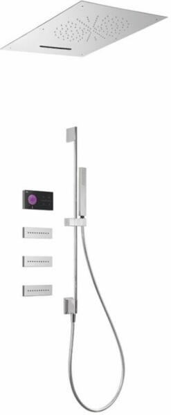 Fekete elektronikus vezérlő Falba építhető elektronikus 4 utas belső egység 500 x 650 mm-es rozsdamentes acél mennyezeti fejzuhany 2 fúvókával 3 vízkőmentesített fúvókával 760 mm-es zuhanyrúd vízbemenettel Vízkőmentesíte tt kézi zuhannyal Szatén zuhanytömlővel Króm kivitel