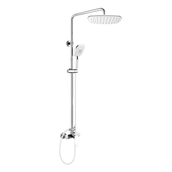 Műszaki adatok: Oszlop anyaga: rozsdamentes acél, ABS Oszlop befejezése: króm Magasság: 950 mm Oszlop szélesség: 22 mm Távolság a faltól: 380 mm Szappantartó Csúszó tartó a kézfejhez Állítható tartókonzolok Esőzuhany anyaga: műanyag Esőzuhany bevonat: króm / fehér Zuhanyfej mérete: ø225 mm Fej anyaga: műanyag Kézidarab felület: króm / fehér Funkciók száma: 3 Csatla